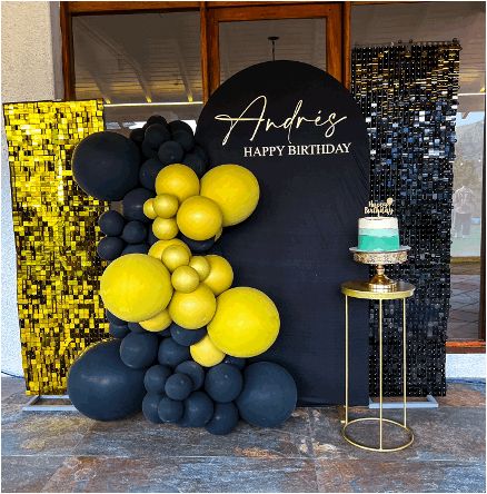 Panel negro tipo media luna, 2 paneles tipo sequin, frase personalizada, guirnalda de globos orgánicos, frase personalizada, mesa decorativa, soporte para pastel, montaje y decoración.